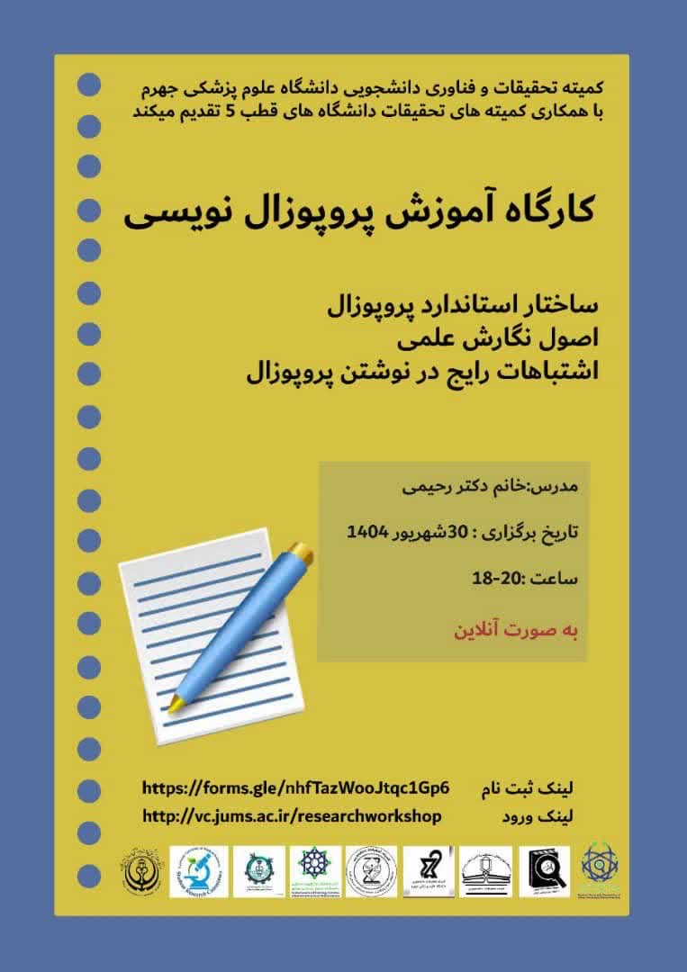 کارگاه آموزش پروپوزال نویسی 1404/06/29 - 11:33 - تعداد بازدید: 86 - تعداد بازدیدکننده: 83 - کد خبر : 3851 - گروه خبری : اطلاعیه,اخبار معاونت,گزارش تصویری - تعداد نظرات : 0